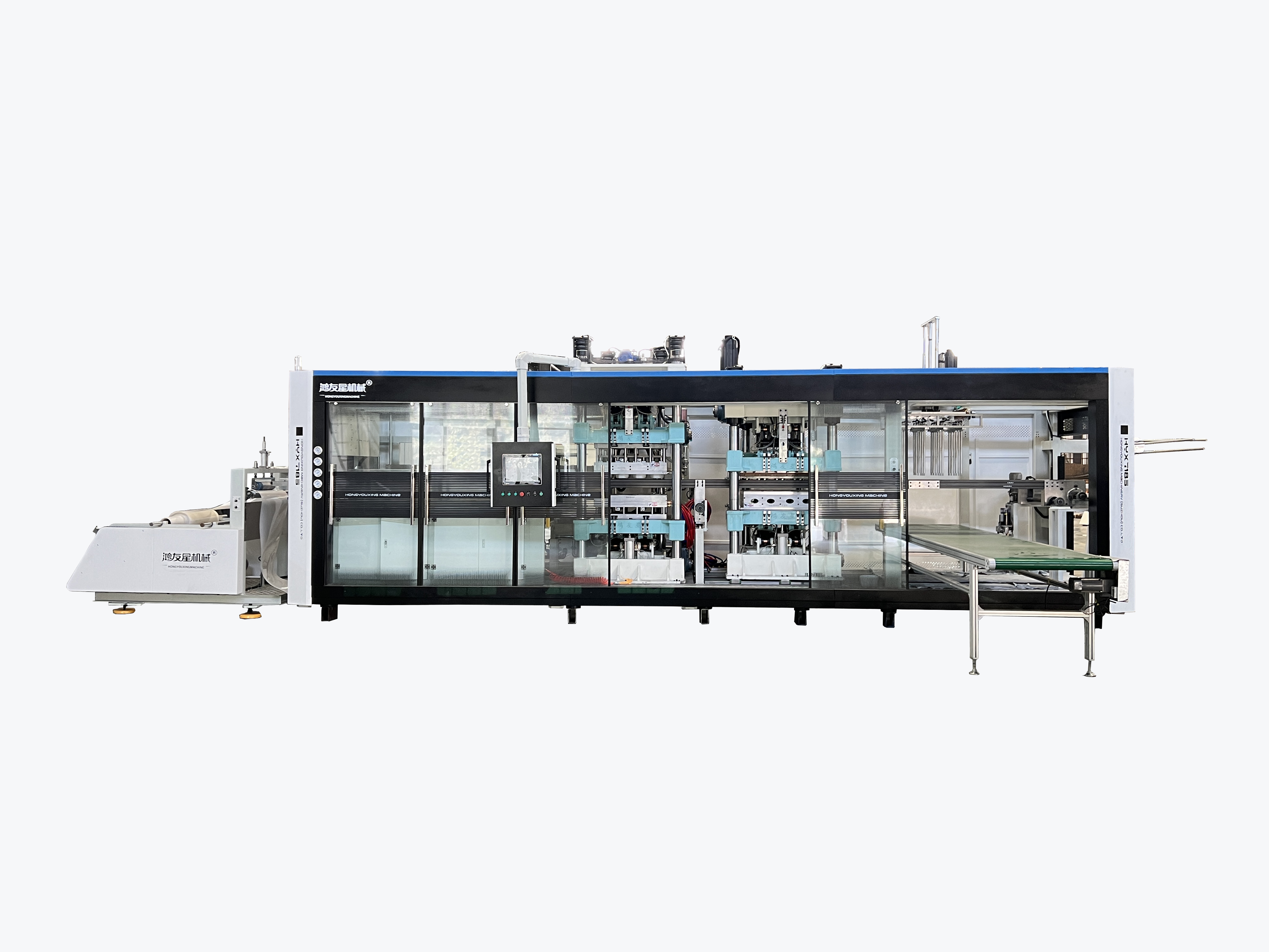 我們的主要產品有 HYX-850全自動正負壓3/4工位熱成型機(成型-裁切-沖孔-堆疊)、 HYX-1220 PLC全電腦控制自動真空熱成型機、 HW-7072負壓成型裁切一體機(成型-裁切-堆疊)、 HW-730自動氣壓成型杯蓋碗機、 厚片吸塑機、 30-150T液壓裁斷機、 冷水機和空壓機等輔機、 熱成型模具。